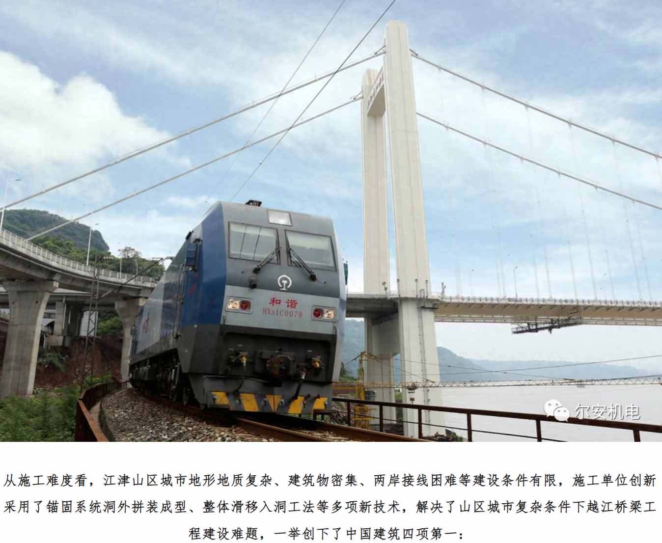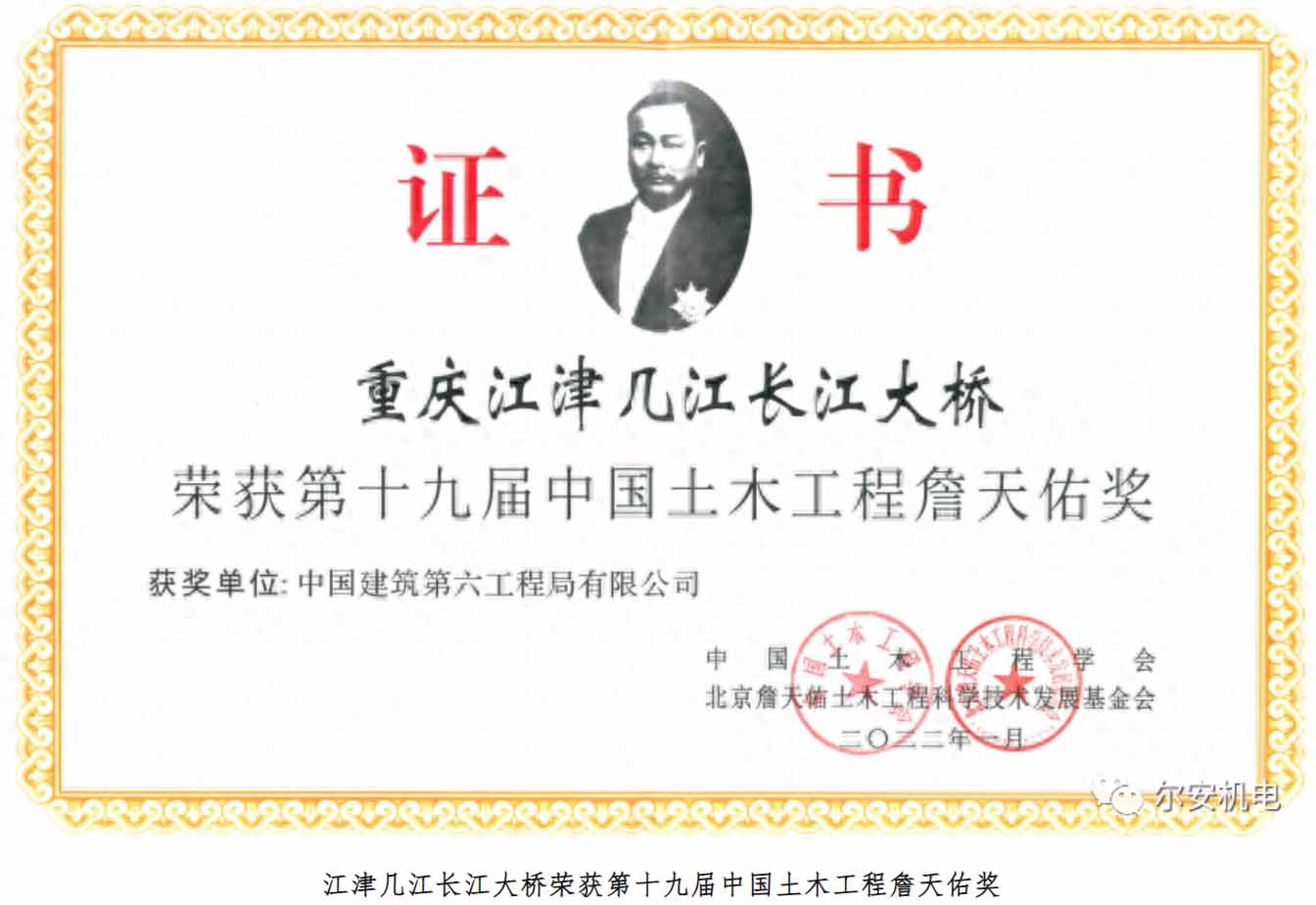 2023年9月5日上午的重庆江津几江长江大桥项目继2019年获“国优奖”后又获中国建筑首个国内桥梁工程詹天佑奖。从规划设计看,大桥起于南岸东门口、止于北岸南北大道,与周边环境和谐相融。它是中国建筑承建首座跨主河流域(长江)悬索桥,北岸隧道式锚碇为国内最长锚塞体隧道式锚碇。尔安机电参与大桥机电工作,面临时间紧、任务重难题,项目组成员在近两个月里克服酷暑、大雨等困难,保质保期完成机电任务,获项目指挥部和江津区主要领导高度赞扬与肯定,对推动江津“一江两岸”建设现代化宜居新城有积极作用